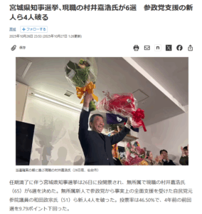 結果 宮城県知事選(選管確定)氏名、党派村井 嘉浩 無所属340,190票和田 政宗 無所属324,375票遊佐 美由紀 無所属176,287票伊藤 修人 無所属20,445票金山 屯 無所属3,663票 2025年10 […]