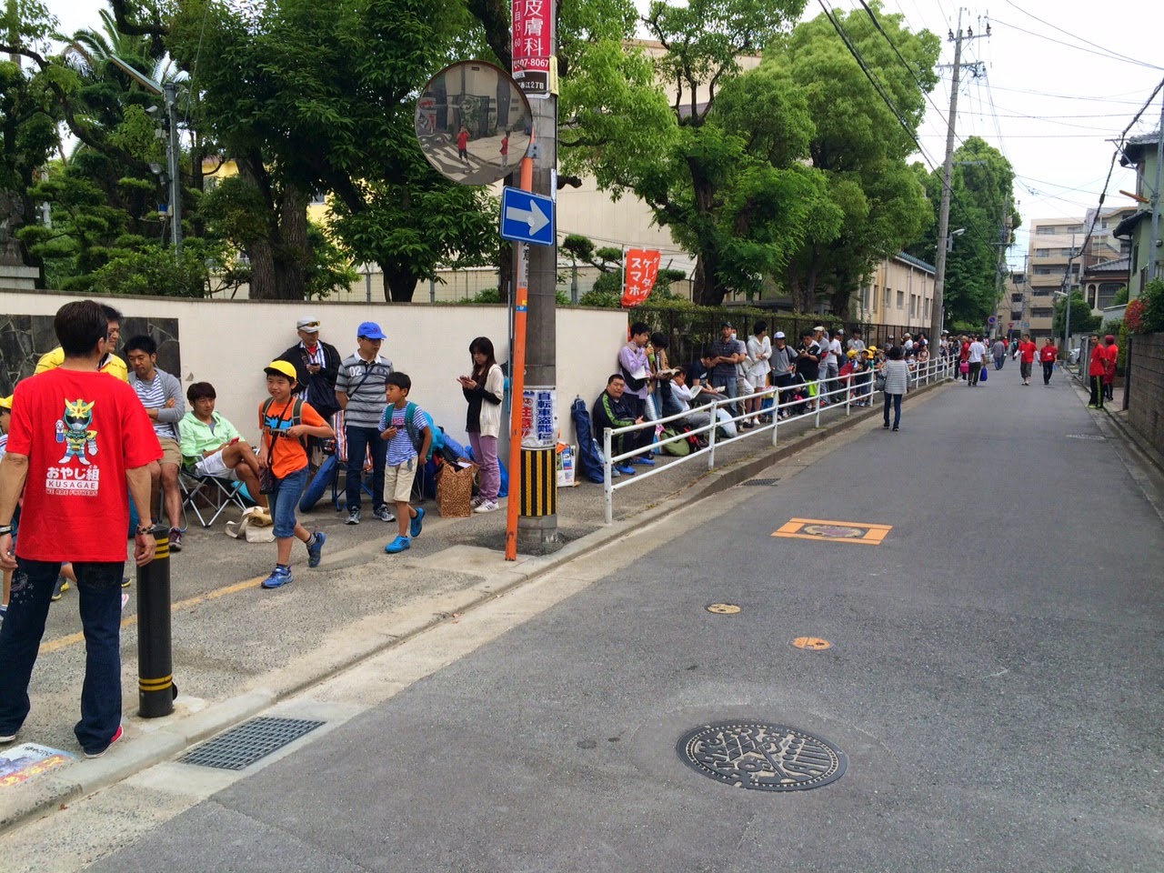 これまで続いていた、開門の瞬間、まさにえべっさんの福男選びのお祭りの如く場所取りに走るというあまりよろしくない風習を打破したいと考えた保護者の有志が数年越しに運動会保護者観戦者客列整備を編み出しました。