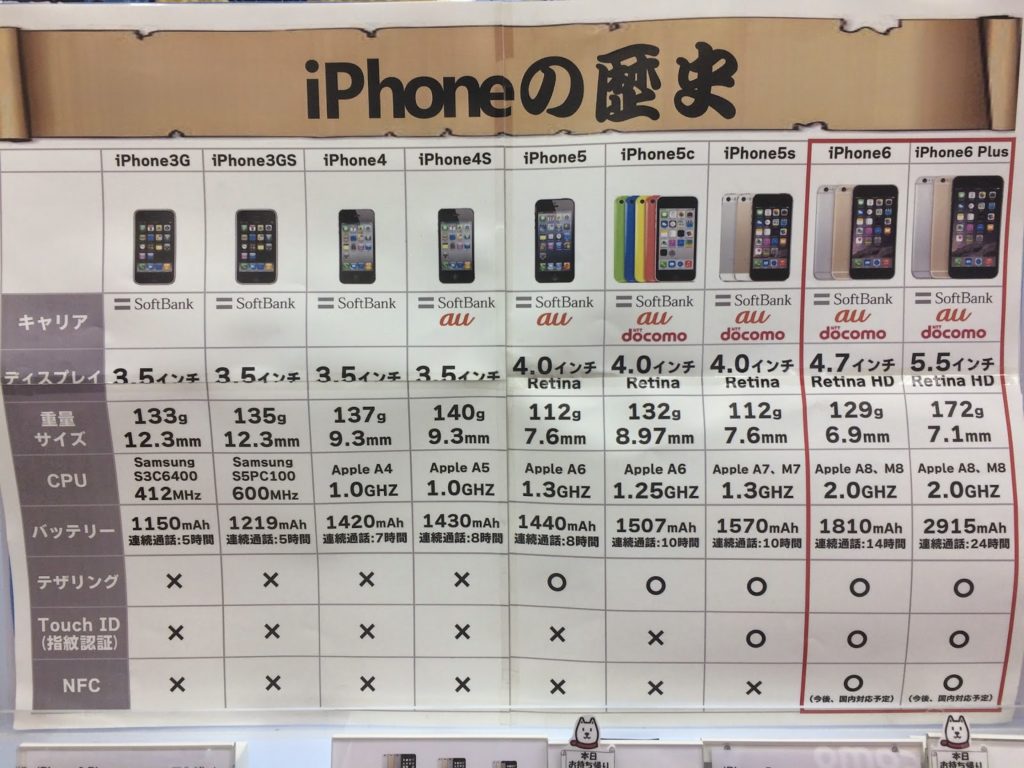 さて、iPhoneの歴史が一覧できる面白い表があったので、写真に撮ってきました。