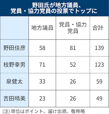 立憲民主党の代表選で地方議員や党員による投票は野田佳彦氏が139ポイントでトップだった。枝野幸男氏の123ポイントが続き、泉健太氏が59ポイント、吉田晴美氏が49ポイントだった。