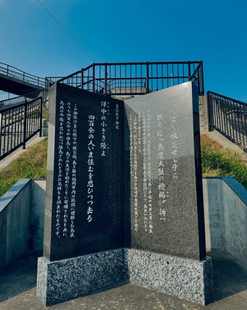 天皇・皇后両陛下(現在の上皇・上皇皇后両陛下)が西方沖地震からの復興を目指す島民を励まされたときの記念碑になります。