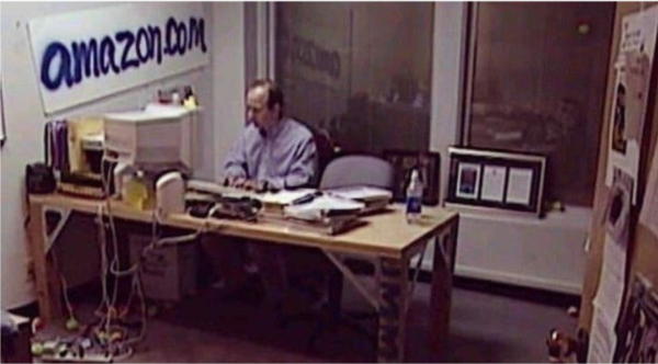 このぼろいオフィスと配線の山とおっさんが一人。これがそうです。あの今はどこでもありそうな会社、Amazonの創業時の姿です。どこにでもありそうな風景でしょ?
