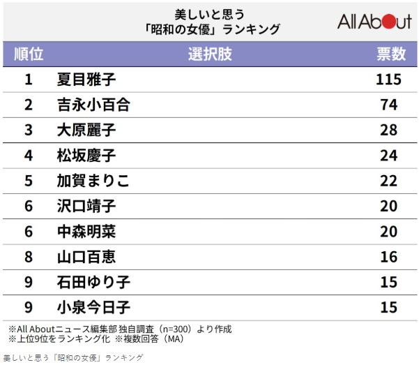 こちらも、男女問わず、「日本画の美人のような繊細な美しさが、他の人にはない、彼女だけのものだと思うから」「どの角度から見ても完璧な美しさだから」「着物姿の美しさや端正な顔立ち、気品のある佇まいが圧倒的。儚げな雰囲気と凛とした表情のギャップも魅力的で、今でも伝説的な美人女優と語り継がれている」という圧倒的な評価です。