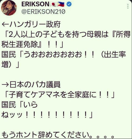 不倫ガソリーヌ議員として一世を風靡した、かの女子元議員(筆者と同じ年度生まれ、つまり同級生)が、子育てケアマネージャーなる新しい利権を盾に国会に戻ってくる運動を始めたようですね。そんなのいらん。出生率向上の政策としては、生んだ女子に減税、これで十分でしょう。私は男ですが、妻(3人の子持ち)の分の所得税払いますよ。。。