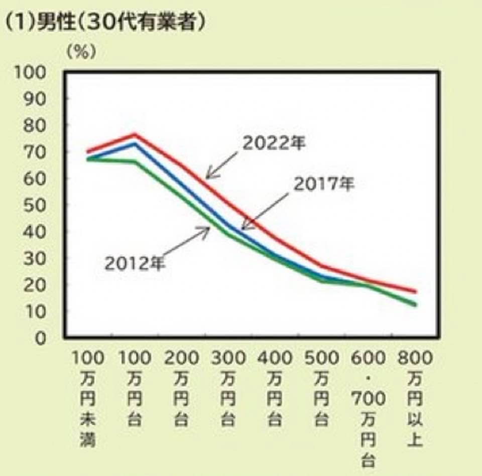 内閣府発表の年収別未婚率。結婚してればほとんどのカップルは子供は複数産んでるから、結婚できる環境にすることが一番大事。