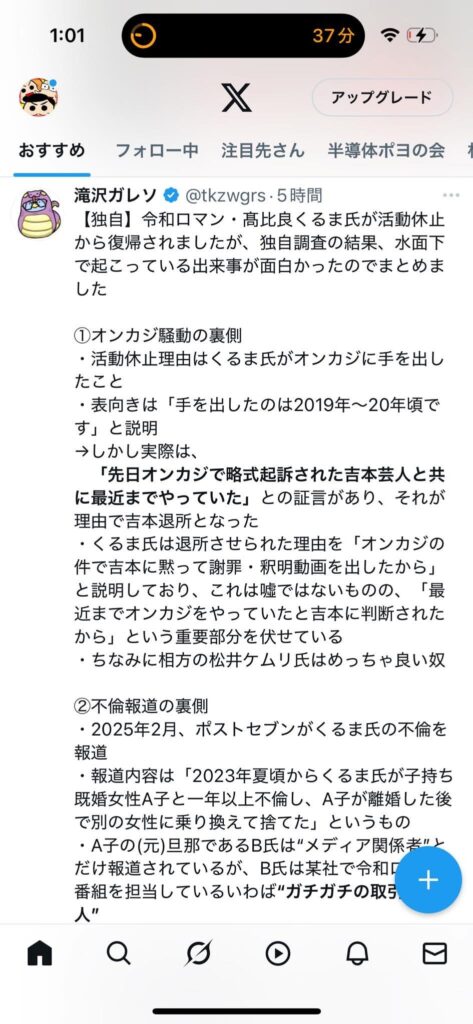 何度も言ってるが、自己愛と顕示欲が肥大した透明ちゃんは、予てから女子アナウンサーとして梲(うだつ)が上がらない事に不満を溜め込んでいたところ、中居が自分に興味を持ち肉体関係にもなった事で「もしかしたら結婚できて皆を見返せる!一発逆転だ」と嬉々としてたら、中居の熱量が薄くなり軽く扱われ「遊ばれただけかもしれない」と疑心暗鬼になってメンヘラが暴発して憔悴してフジテレビを退社した。そして、それを嗅ぎ付けた週刊誌に釣られ、金と承認欲求を満たす詐話に便乗した。この際、自分を「被害者」であるとすると同時に、中居に遊ばれた事にも矮小な自尊心が許さず、本当は好きじゃなくて仕事の延長だったから断れなかった、つまり「性暴力」だったとストーリーを作った。「そう言え」と周辺の輩に空気入れられたかもしれない。何にせよ、他人の信用や生活を踏み躙っても自分の下劣極まりない自尊心を満たしたいだけのカスだ。あまつさえ、剰えPTSDという病気やその患者や看護者まで踏み台にしている。社会的に到底看過できない悪逆である。