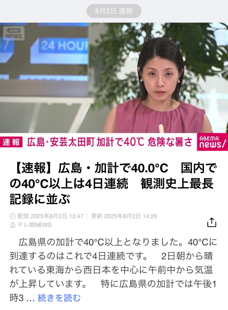 暑すぎる理由 2025-08-02 最終更新日時 : 2025-08-02 ≡ これってもちろん… 暑いですね。原因はもちろん… 太陽光パネルに、決まってるでしょう。日本全国、まさにオーブントースター状態。 以上