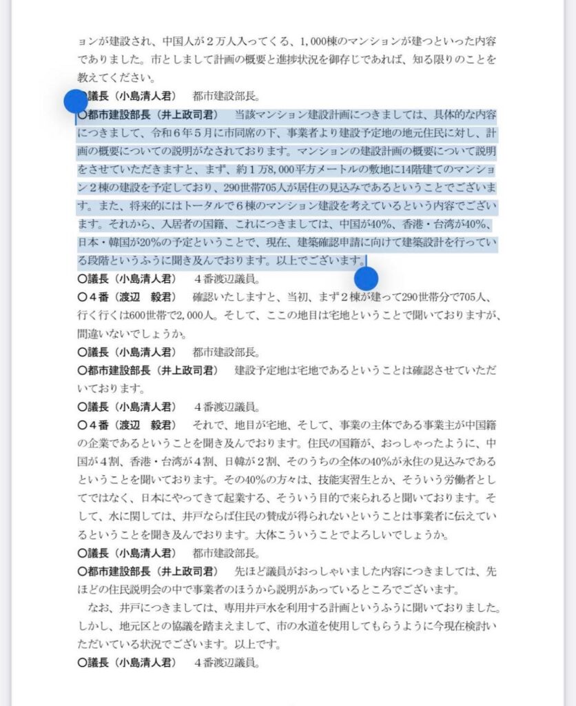 ◎都市建設部長(井上政司君) 当該マンション建設計画につきましては、具体的な内容につきまして、令和6年5月に市周防の下、事業主と建築予定地の地元住民に対し、計画の概要についての説明がなされております。マンションの建設計画の概要について説明のあった内容といたしまして、まず1万7,080平方メートルの敷地に14階建てのマンション6棟を予定しておりまして、290世帯が居住の見込みであることがございます。また、将来的にはさらに6棟のマンション建設を考えている内容でございます。それから、入居者の居住国籍としまして、中国が40%、香港・台湾が30%、日本が30%であるとの説明がございました。現在、建築確認申請に向けて建築設計を行っている段階であるというご回答をいただいております。以上でございます。
