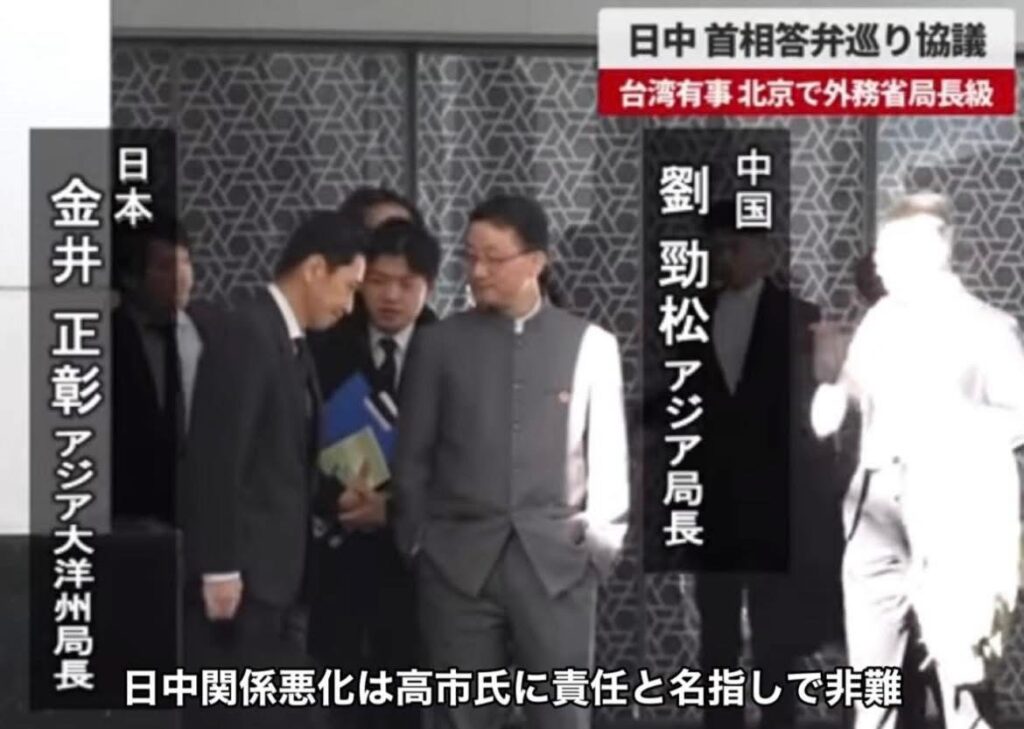 ポケットに手を入れたまま日本外務省高官を見下ろすように立つ中国外交部高官