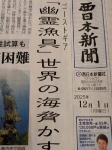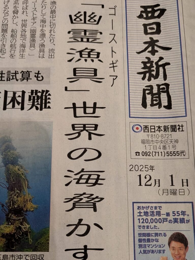 今日の西日本新聞1面は「幽霊漁具」。海に放置された漁具が不必要な形で海の生物を捕らえている現象です。ゴーストフィッシング化している所があります。漁具が生物を捕らえ、その生物の臭いにつられてまた生物が寄ってきては捕らえられ、の繰り返しでエンドレスに生物が捕らえられていく現象です。