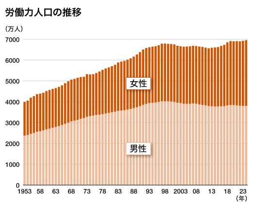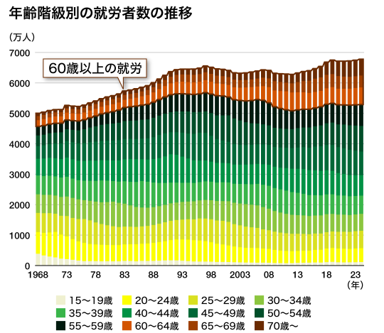 日本の労働者(就業者数・労働力人口)は、少子高齢化が進む中でも高齢者や女性の労働参加、外国人労働者の増加を背景に増加傾向にあり、統計開始以来の過去最多を更新し続けています。特に2024年には労働力人口が6957万人で過去最多、就業者数も6,873万人に達するなど、「7,000万人」の大台も視野に入ってきています。これは、生産年齢人口(15~64歳)が減少する中で、働く意欲のある高齢者や女性が労働市場を支えている構図です。