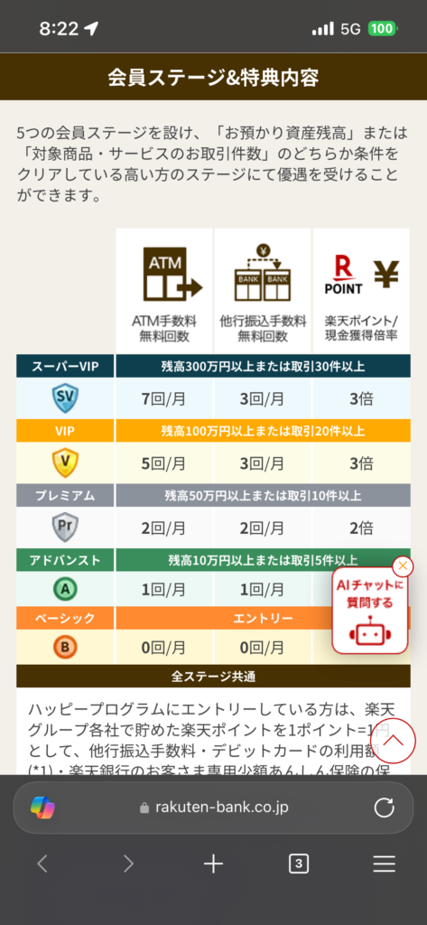 楽天銀行のハッピープログラムで判定に使われる「残高」は 毎月25日終了時点の預かり資産残高です。つまり、25日時点で10万円以上の残高かあれば、翌月の他行向け振込手数料無料特典一回分が手に入るということです。通常、145円以上の振込手数料がかかりますから、一年で145円×12ヶ月分、すなわち1,740円の費用削減となります。必要なお金は10万円ですから、これは日本円の年利換算で1.74%の運用、ということです。時間を価値に変えるとはこういうことを言います。