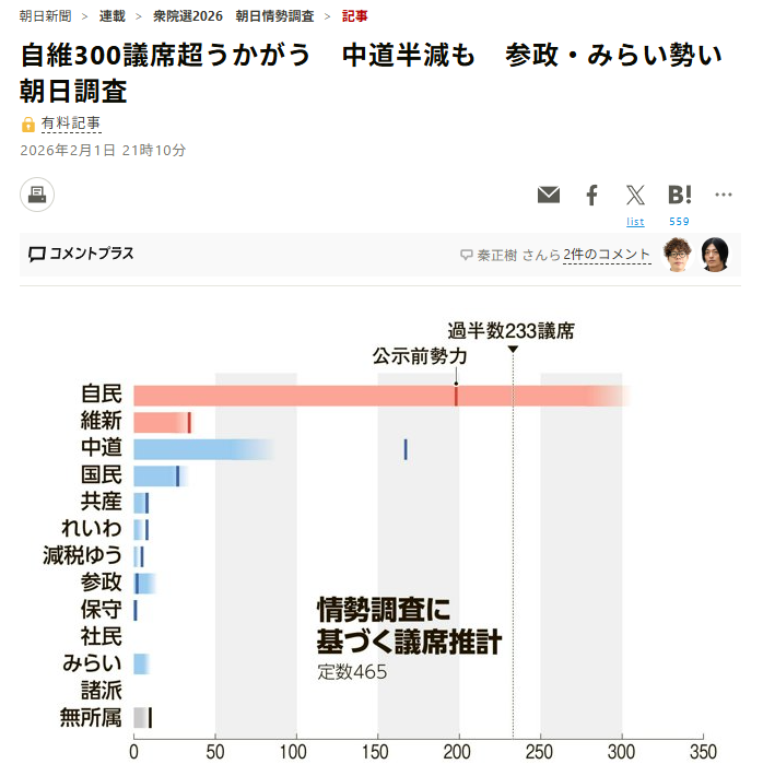 自民があ大幅議席増で、中道は壊滅的打撃との予想です。
