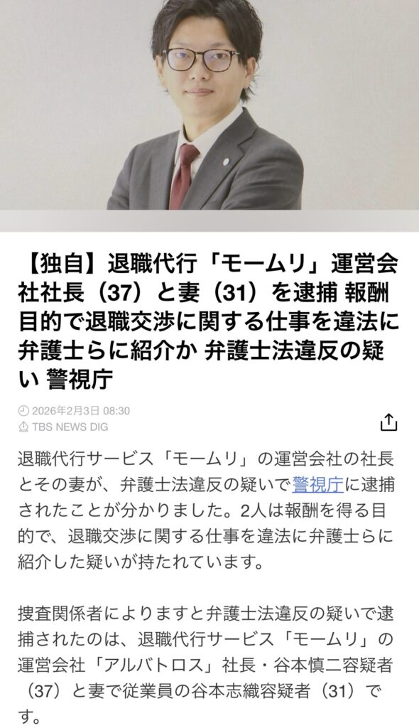 退職代行サービス「モームリ」の運営会社の社長とその妻が、弁護士法違反の疑いで警視庁に逮捕されたことが分かりました。2人は報酬を得る目的で、退職交渉に関する仕事を違法に弁護士らに紹介した疑いが持たれています。
