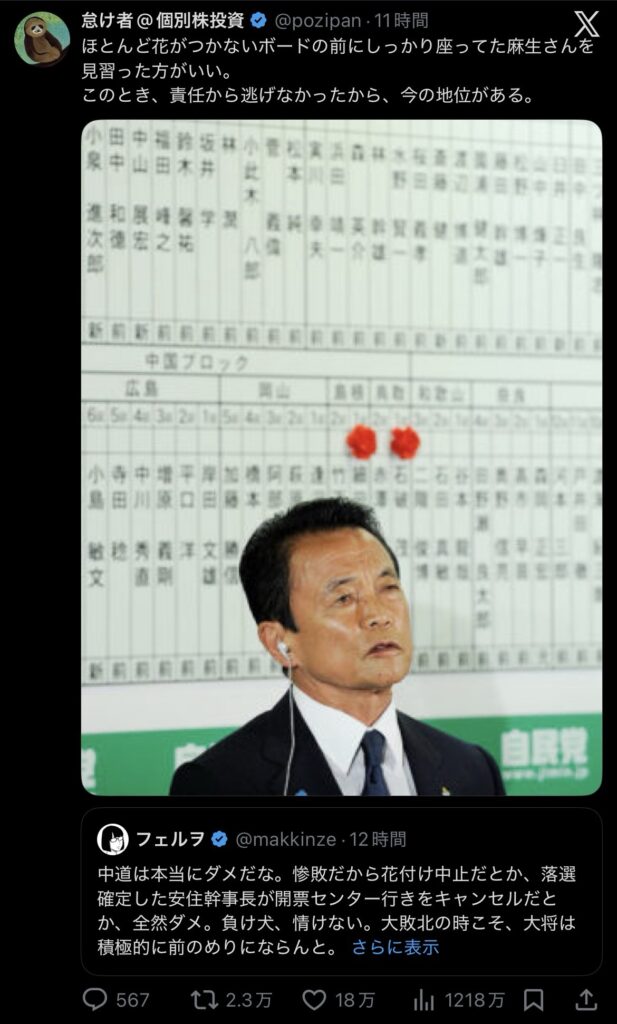 2026年衆議院議員総選挙において、一番に当確出たのは福岡10区の麻生太郎さんでした。そして、この麻生さんは、自民党が政権を失った2009年総選挙に大敗した、時の総理大臣でした。皆忘れているかもしれませんが、人間、負けた時の振る舞いでその真価が問われます。中みちなんちゃら連盟の皆さん、特に執行部のみなさん、今こそ堂々と敗軍の将として、その姿を晒す必要があるはずです。