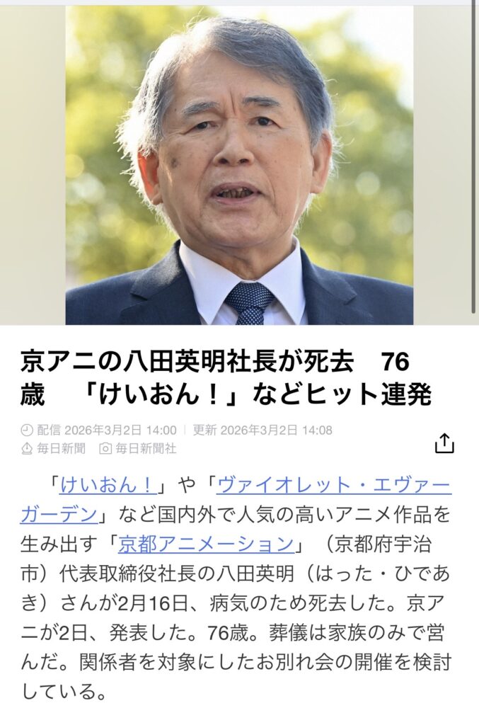 19年7月には同社の第1スタジオ(京都市伏見区)で放火殺人事件が発生。36人の社員が犠牲となった。毎年、事件発生日には現場跡地で追悼式を営み、八田さんも参列。25年の式では事件後に11作品を発表したことを報告し、「心を一つにして恥ずかしくない作品を作り続けたい」と語っていた。