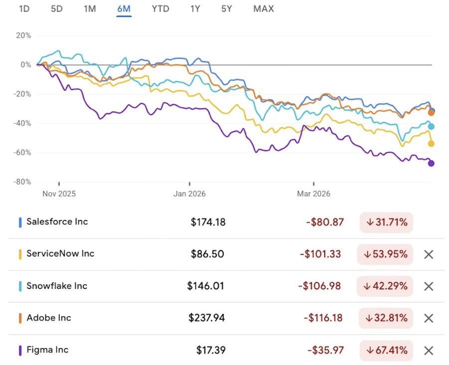 Figma:-67%;ServiceNow:-54%;Snowflake:-42%;Adobe:-33%;Salesforce:-32%。